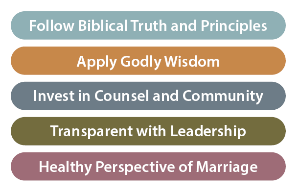 - Maintain open dialogue with church leadership throughout the entire marriage decision process, along with counsel from other support people to whom you are accountable. (Romans 12:5)