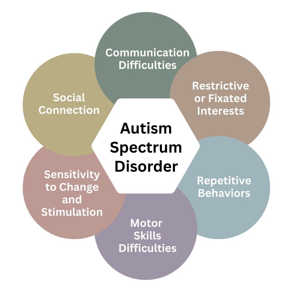 Autism spectrum disorder (ASD) is a development disorder characterized by difficulties in relational connection and atypical behavior. Autism presents differently from one person to another based on an individual’s specific difficulties and the severity of those difficulties. The image below breaks down some of the common areas involved with Autism spectrum disorder.