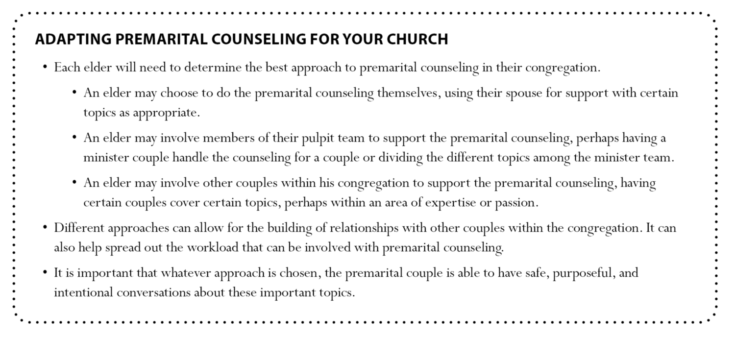 - Coordinated care – Coordinated care among elders is recommended when you have a brother and sister from two different congregations. While there are exceptions to this rule, it is helpful to have the premarital counseling provided by the elder at the church the couple will regularly attend once married. This supports relationship building and integration into the couple’s future home church.
