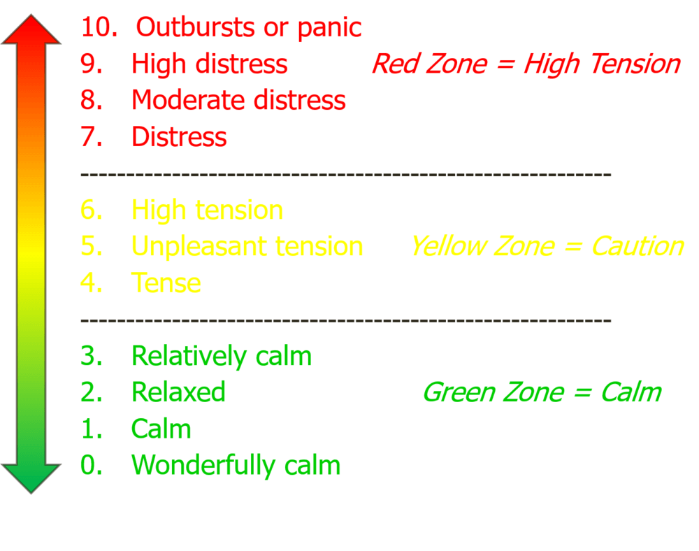 If you are in the Yellow Zone (4-6) be aware that you are quickly move into the Red Zone (7-10), so pay attention and work to stay calm.