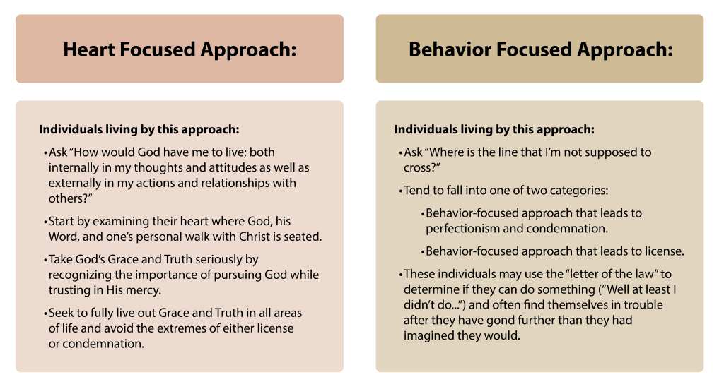 Along with thinking and living in Grace and Truth, we want to encourage readers to use a “heart-focused” method of considering the topic of sexuality instead of a “behavior-focused” approach. We have described each below:
